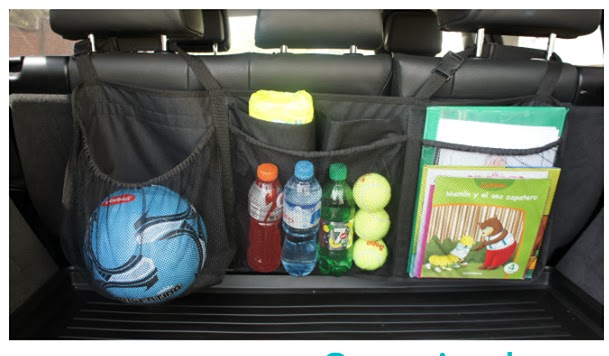 • Organizador para maletera: Se coloca en los respaldos de los asientos traseros y tiene compartimentos grandes para guardar cosas y evitar que estén rodando por toda la maletera (por ejemplo pelotas).