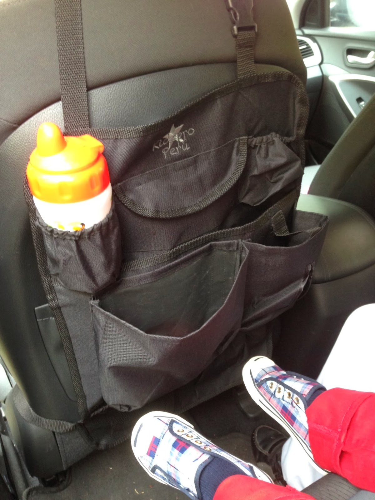 - Organizador de asiento para carro: Se coloca en el respaldo del asiento y tiene varios bolsillos al alcance de los chicos, pueden guardar sus juguetes, tiene dos compartimentos para sus toma todo, un espacio para poner pañitos húmedos y un espacio considerable para colocar una bolsa de plástico para botar ahí los desperdicios (así les enseñamos a nuestros hijos que la basura no se tira en la calle). A mí me ha pasado que cuando estoy manejando y mis hijos están comiendo algún snack cuando terminan esperan que mi brazo se estire cual chicle para poder agarrarle la envoltura o para alcanzarle un pañito húmedo. No les ha pasado? Ahora con mi organizador ellos mismos botan su basura 🙂 Esto también los hace más independientes porque ellos mismos guardaran y harán sus cosas
